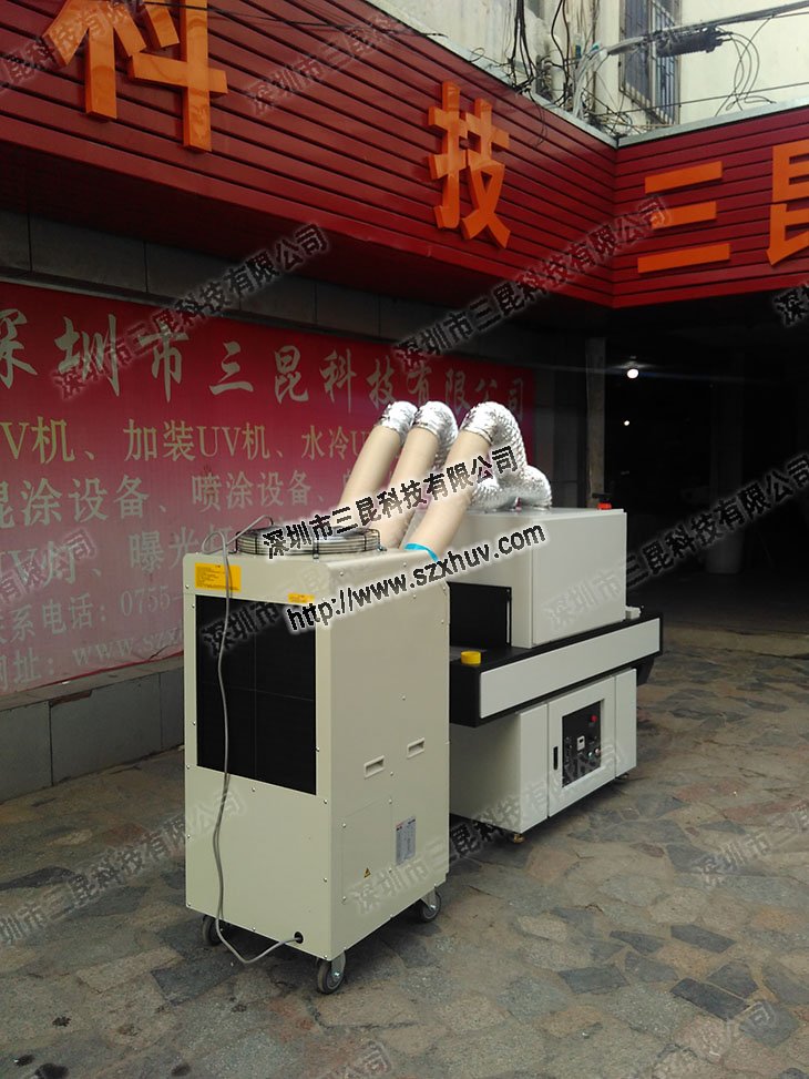 uv固化爐,旁邊的風(fēng)冷輸送機(jī)是客戶提供的。這款移動(dòng)式冷氣機(jī)SAG-65是三出氣口對(duì)